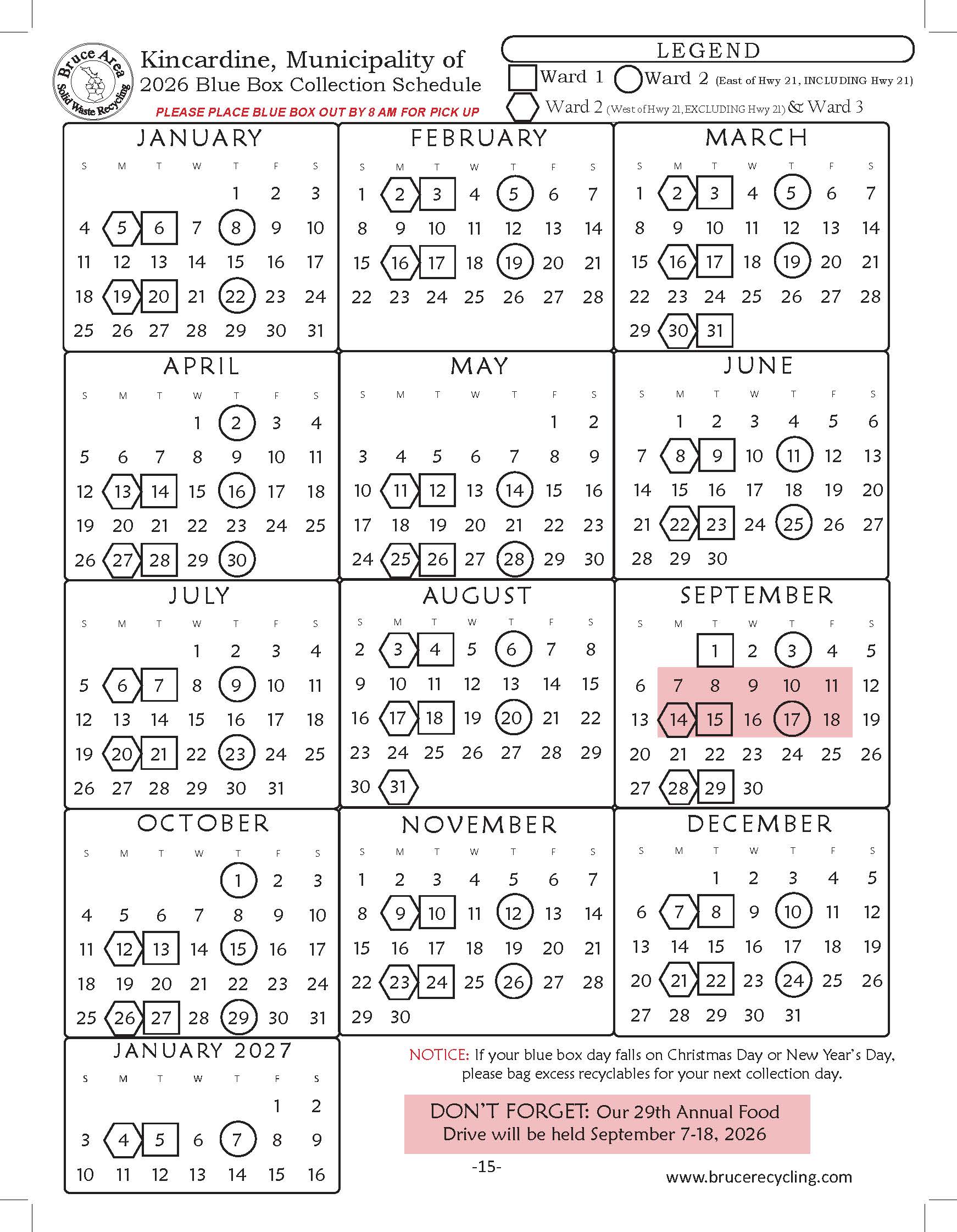 Visit Kincardine | Circular Materials | Ontario for up-to-date information on Blue Bin collection.